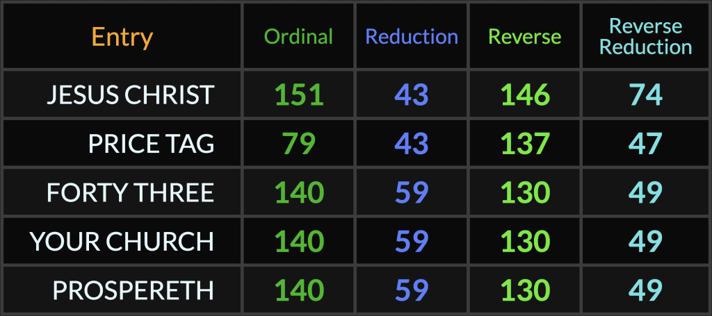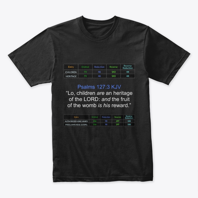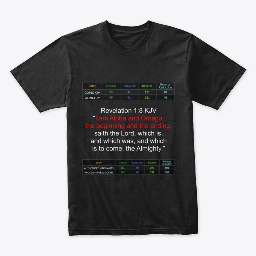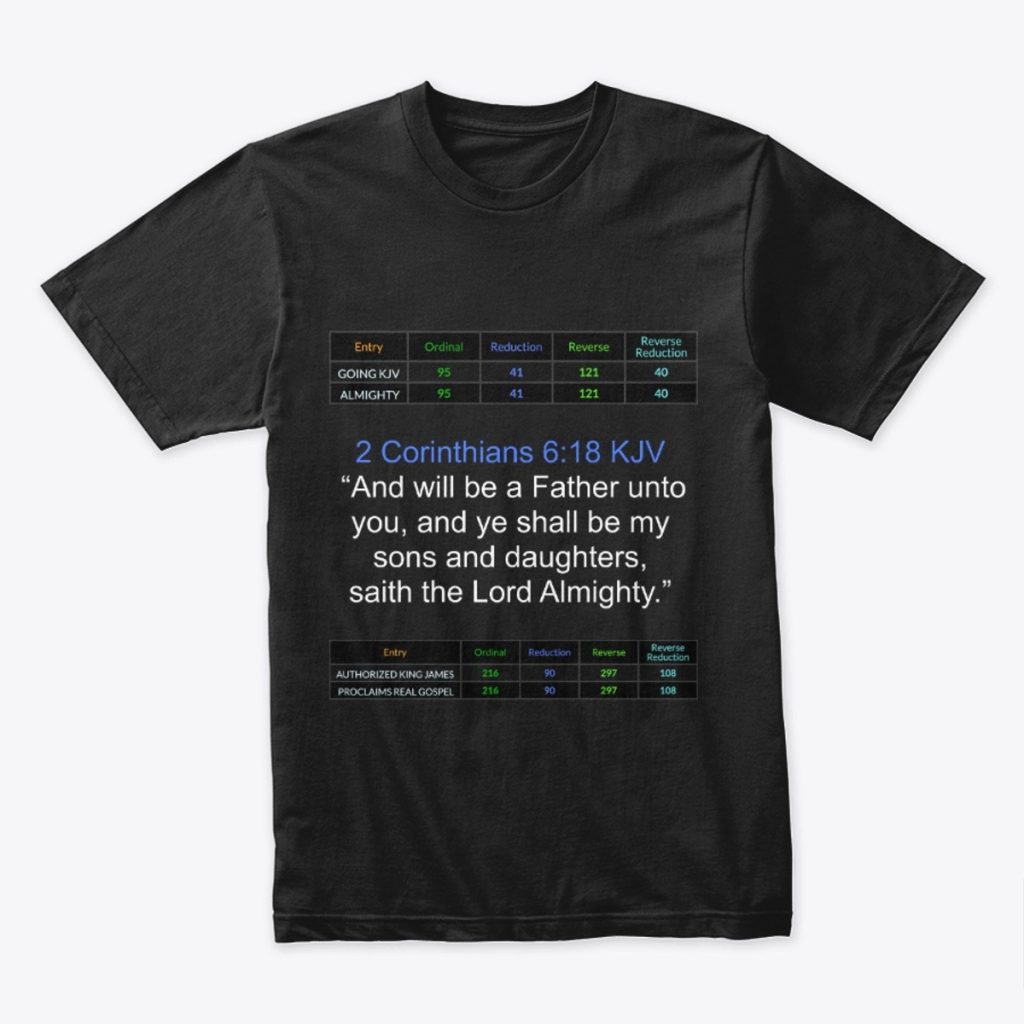 Gematria is the language that was used by God to create everything. It combines letters of the alphabet with numbers. This site features black T-shirts celebrating select verses from The KJV Bible. Each design features the “Authorized King James” = “Proclaims Real Gospel” 4/4 gematria at the bottom. All T-shirts are $43.00 because “Jesus Christ” is 43 in Reduction as is “Price Tag”, and “Forty Three” is a perfect match to “Your Church” and “Prospereth”.